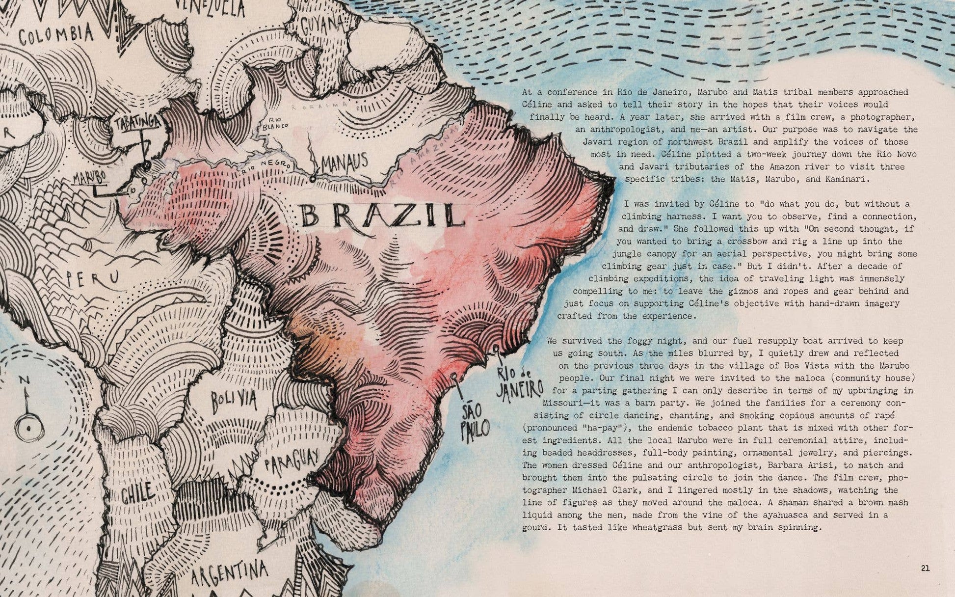 Based on Jeremy Collins’ extensive, art-filled travel journals, Eventually a Sequoia is part memoir, part manifesto. Collins, already highly regarded as an artist and climber, was invited to bring his sketchbook on a new kind of adventure: documenting the experiences of those who live along the endangered Amazon River. From there, his art and his curiosity took him to other endangered corners of the world, including the Arctic National Wildlife Refuge, the mountains of Nepal, Bears Ears National Monument, and the soaring redwoods of California.