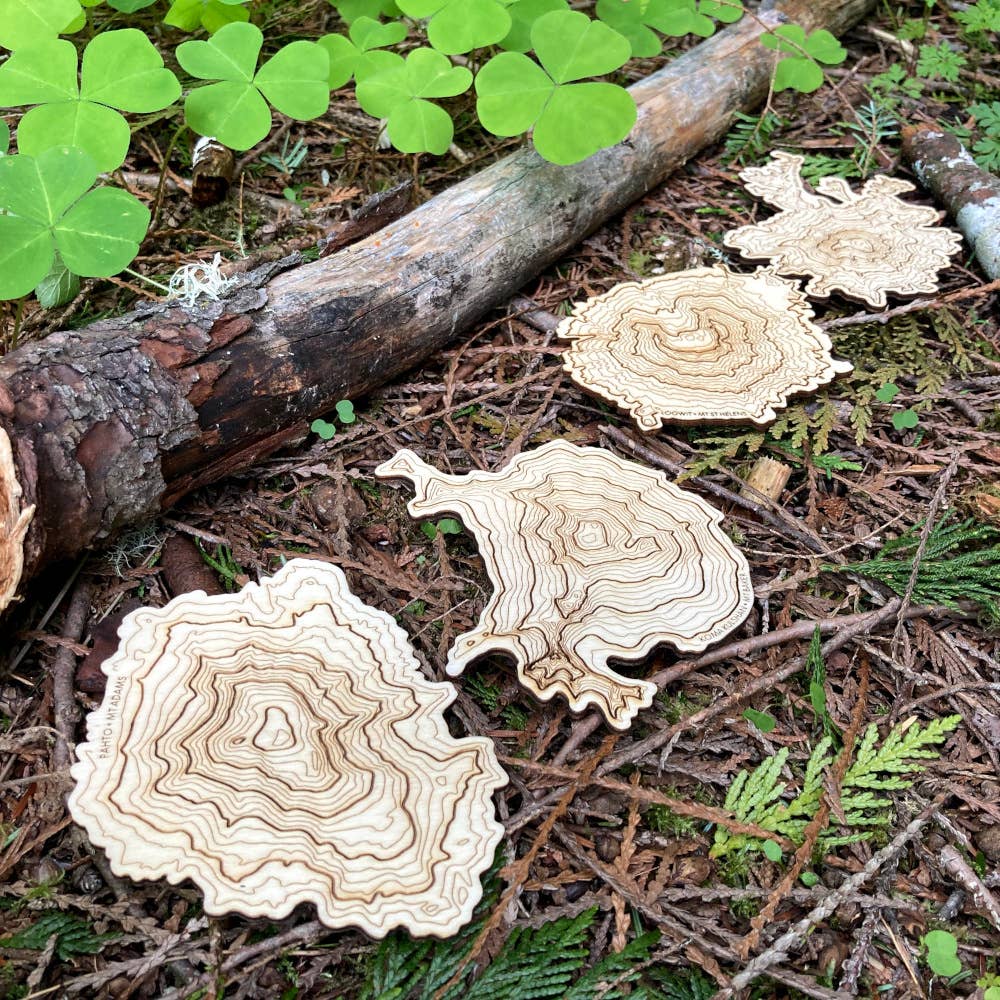 These Washington Volcanos Wooden Coasters features laser engraved maps of Mt Rainier, Mt Baker, Mt St Helens, and Mt Adams.
